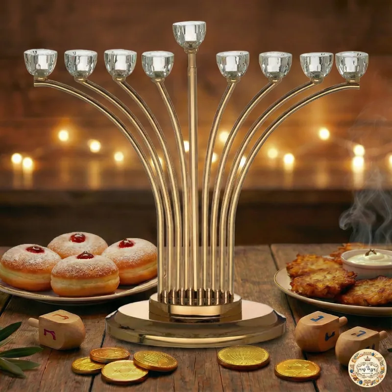 חנוכיית מתכת עם ראשי קריסטל גימור זהב 43ס"מ