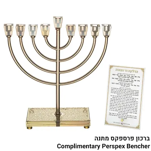 חנוכיה מתכת זהב עם בסיס קריסטל ופלקטה 36סמ