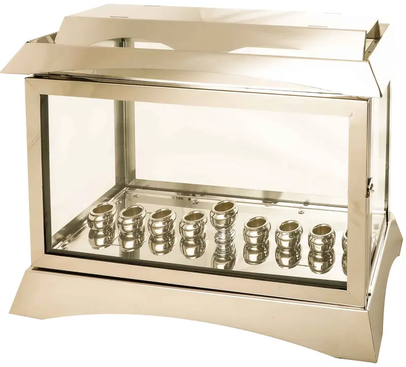 בית חנוכייה מהודר ממתכת וזכוכית עם בתי נר בגוון